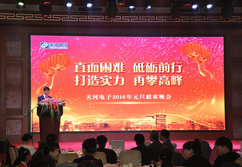 2015年12月31日,天河電子2016年元旦晚會在星光大酒店二樓場鑫軒隆重舉行,大會表彰了2015年度在公司市場、研發(fā)、工程等各個領域作出突出貢獻的優(yōu)秀團隊和個人。公司總經(jīng)理苗立在會上做了重要講話,總結了2015年我們所經(jīng)歷的挫折與喜悅,分析了2016年的行業(yè)市場形勢,并提出2016年我們的工作目標,那就是進一步強化“三個意識”,做好“三個堅持”,著重做好“三項管理工作”,做好“三個引進工作”,實施“三個打造”,全面提升公司綜合實力,把握機遇,力爭使公司2016年經(jīng)營業(yè)績創(chuàng)歷史最高紀錄 。
